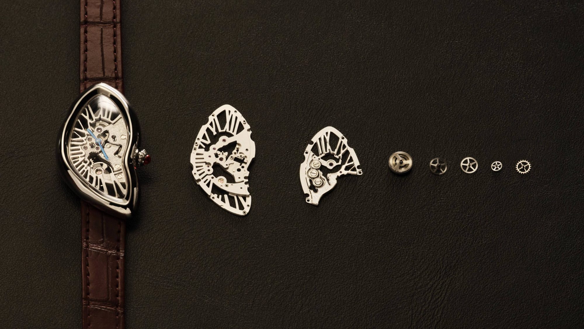 Née en 1967 en plein Swinging London, la Crash est probablement la montre la plus radicale jamais sortie des ateliers Cartier. Son cadran asymétrique a révolutionné les conventions esthétiques de l’horlogerie, et depuis, elle n’a jamais été éditée qu’en séries très exclusives, et c’est sûrement ce qui la rend si désirable. Pour ce 10e opus, Cartier lui offre un nouveau squelette de forme. Le calibre Manufacture 1967 MC a été spécialement développé pour épouser les lignes distordues de ce boîtier impossible, logeant 142 composants dans un espace minimal.
