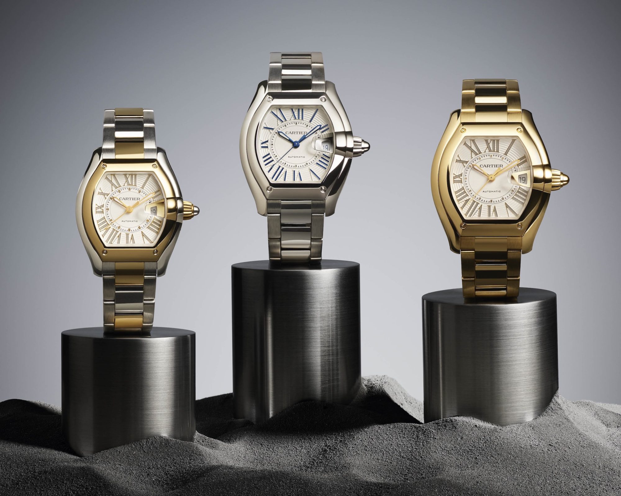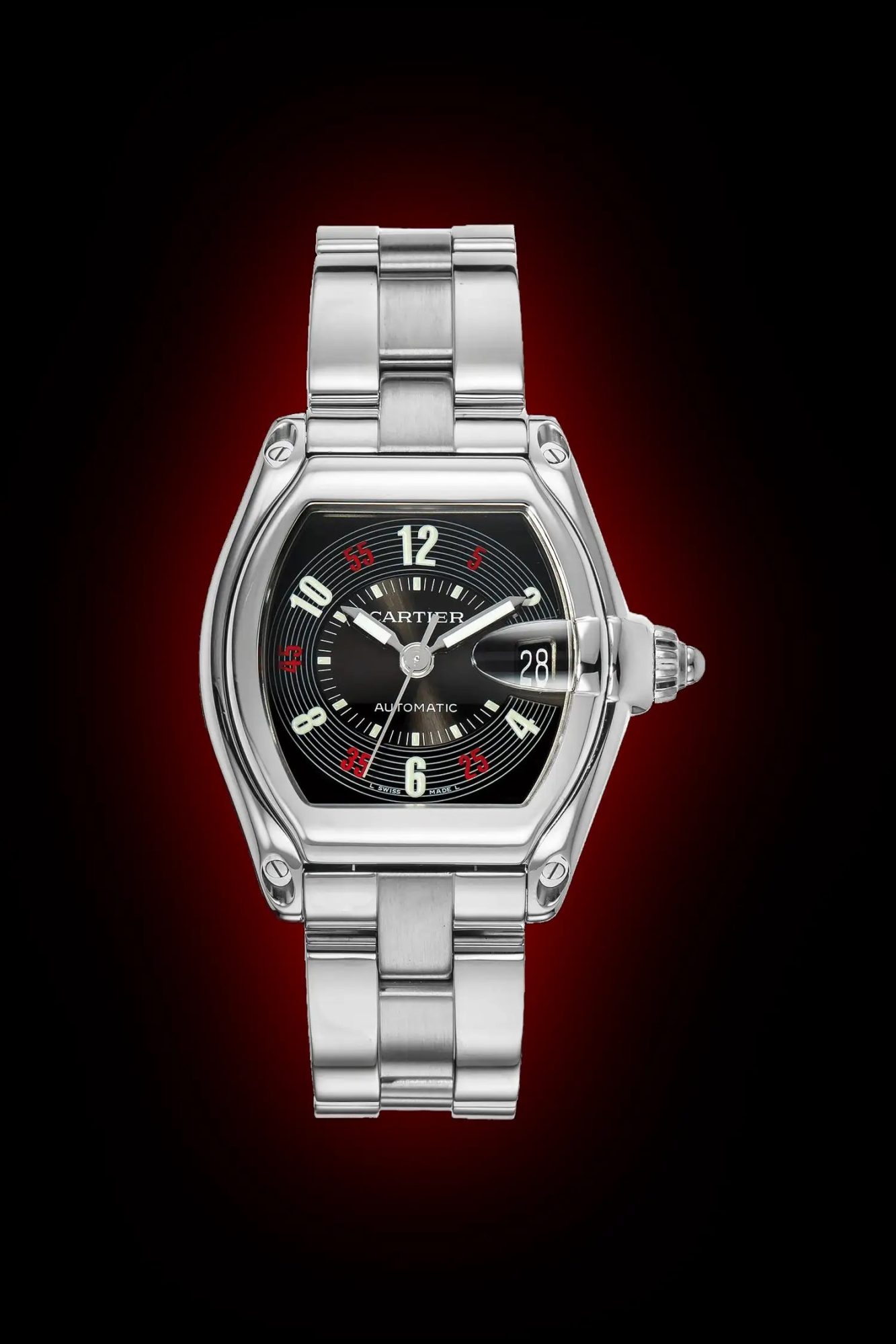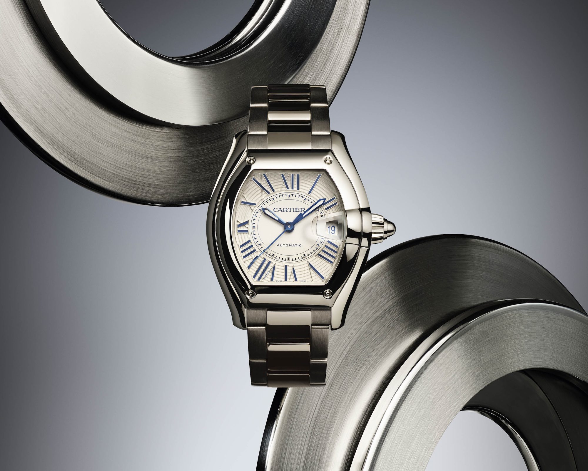Lancée en 2002, la Roadster originale empruntait ses codes aux fuselages mécaniques : cadran strié inspiré des compteurs de vitesse, couronne ogivale, loupe du quantième en forme de phare, rivets apparents. Un vocabulaire automobile assumé, à une époque où Cartier cherchait à élargir son audience vers des amateurs de montres plus sportives. Vingt-quatre ans plus tard, la nouvelle Roadster reprend cette grammaire et l’affine considérablement.