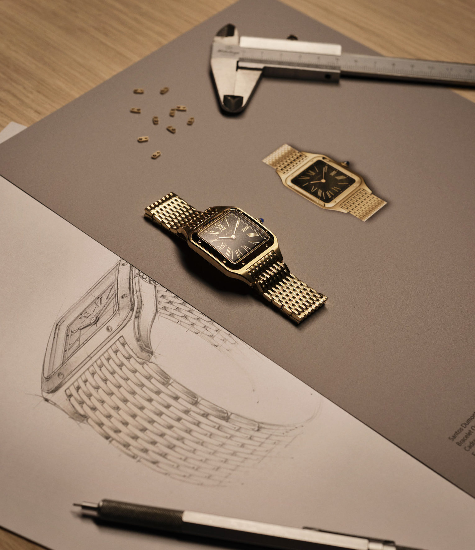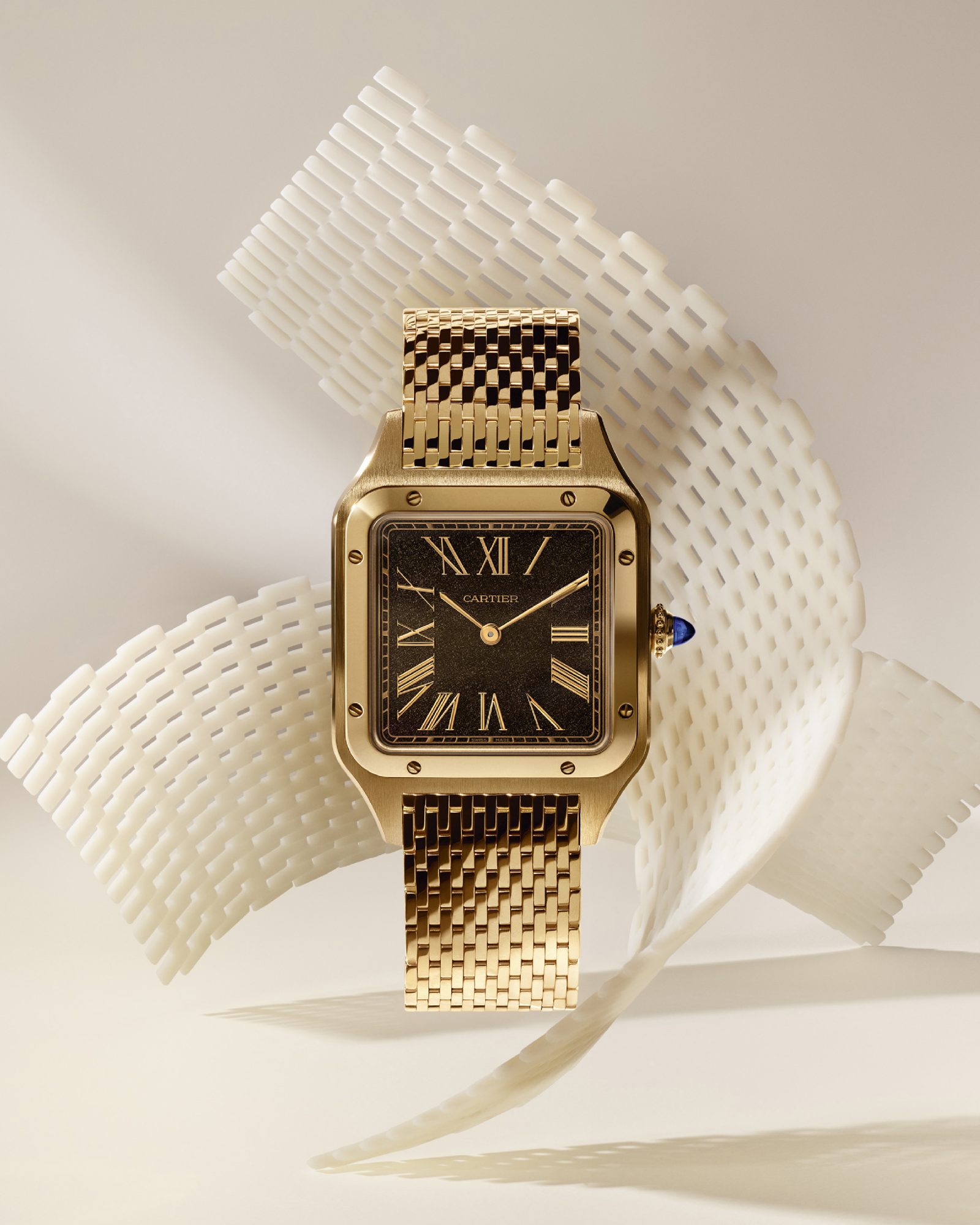 La grande nouveauté, c’est le bracelet. Inspiré par les premiers bracelets de montres en métal développés par Cartier dès les années 1920, le bracelet en or jaune se déploie avec une souplesse remarquable. Les maillons font 1,15 mm d’épaisseur seulement, organisés en maillages de 15 rangs pour un total de 394 maillons usinés, terminés et assemblés à la Manufacture. Sur le papier, c’est un chiffre. Au poignet, c’est une sensation soyeuse, presque textile, qui tranche avec la rigidité habituelle des bracelets métal. C’est probablement l’un des bracelets les plus travaillés que Cartier ait jamais produit pour une montre-bracelet.