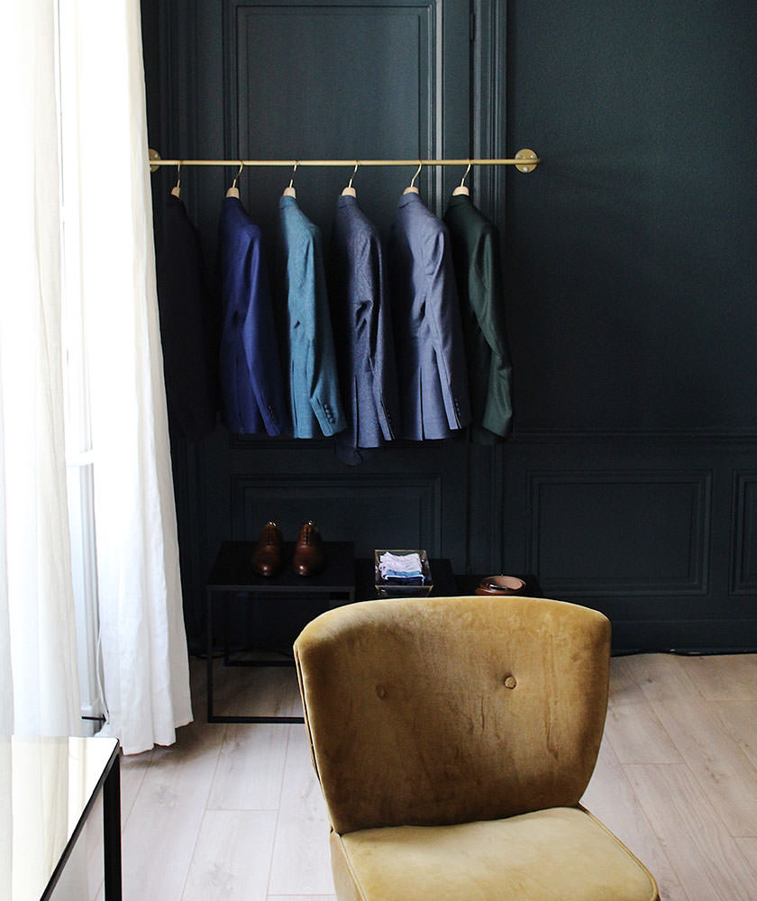 Le showroom privé situé en étage, accessible sur rendez-vous, offre une expérience où chaque détail est orchestré pour un service sur mesure. La boutique dispose également d’une très large gamme d’accessoires de la marque Gentille Alouette (pochette, cravate, noeud papillon).