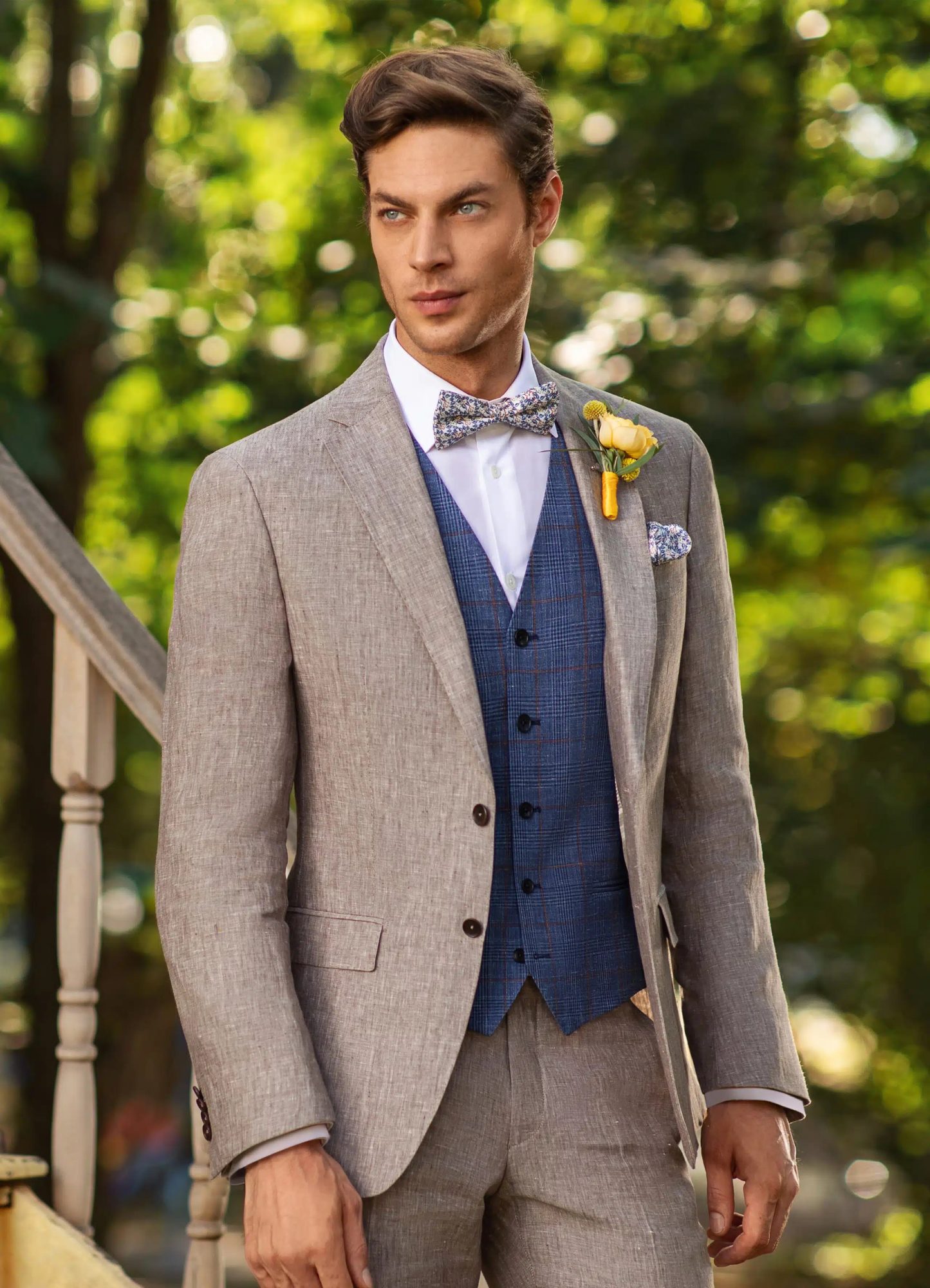 - Lin pur ou mélangé (50-70% lin) : devient non seulement acceptable mais recommandé pour les mariages de juin à septembre. Le froissage naturel du lin perd son caractère négligé sous le soleil méditerranéen, il devient une marque d’élégance décontractée assumée. Couleurs idéales : beige sable, gris perle, bleu ciel.