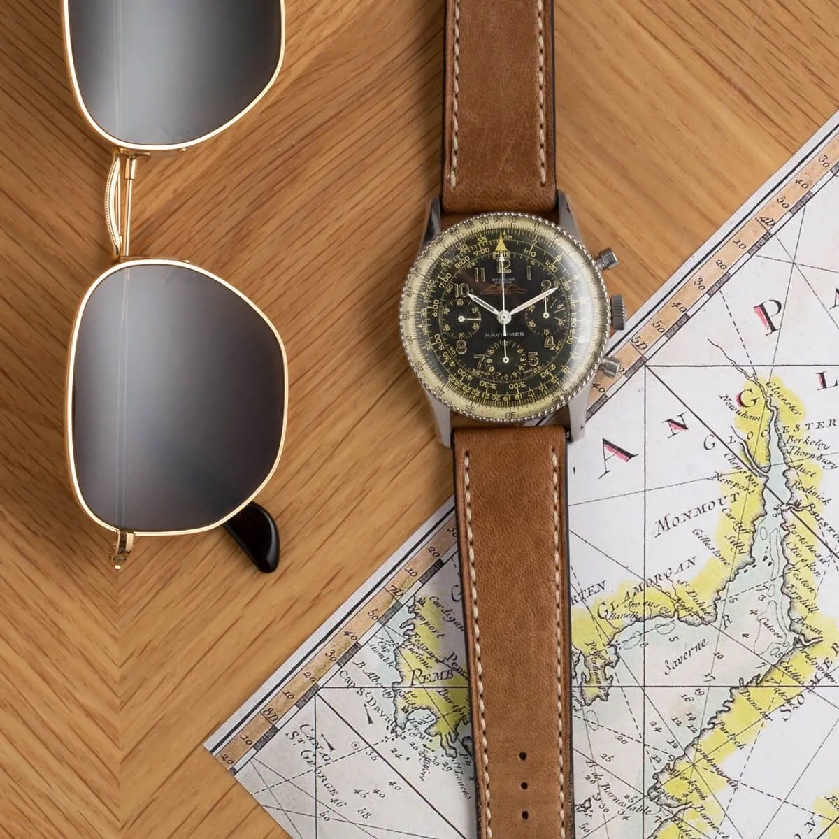 Le boîtier de 41mm, exceptionnellement grand pour l’époque, garantit une lisibilité maximale. Le cadran noir intégral arbore de larges chiffres arabes luminescents enduits de radium, offrant un contraste optimal dans l’obscurité du cockpit. La configuration tricompax, avec trois compteurs positionnés à 3, 6 et 9 heures, abandonne le design bicompax du Chronomat pour une meilleure ergonomie de lecture. Au cœur de cette première Navitimer bat le mouvement Venus 178, un calibre à roue à colonnes réputé pour sa robustesse et sa précision.