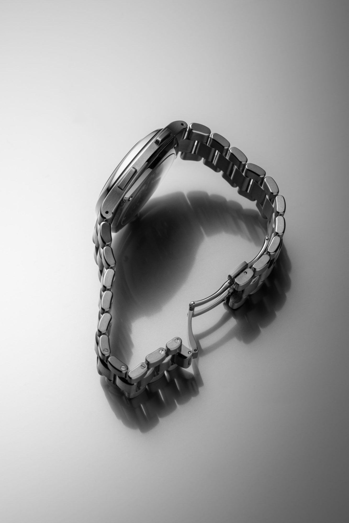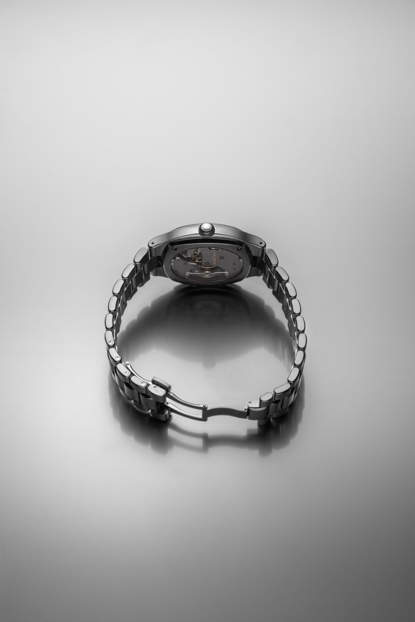 Le bracelet intégré à trois maillons, lui aussi en titane grade 5, prolonge la carrure avec un satinage vertical ponctué de flancs polis. Les maillons centraux, aux côtés inclinés et polis, renforcent la dimension mécanique de l’ensemble. La couronne boule, signature de la maison, est ici vissée et parfaitement intégrée à la carrure. Le verre saphir bombé coiffe la pièce et lui donne ce galbe caractéristique qu’on reconnaît au premier contact.