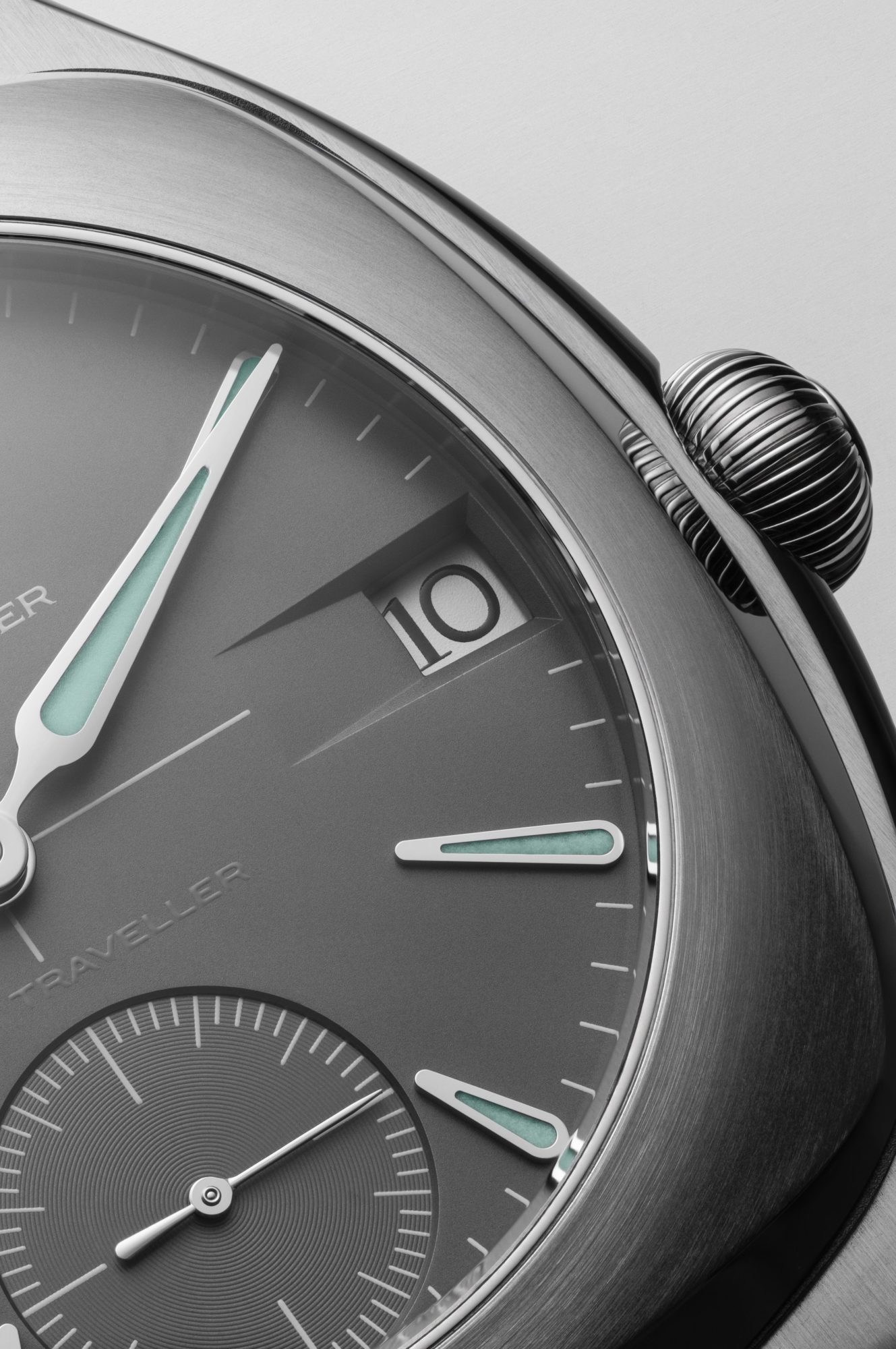Le passage à l’échappement à ancre suisse (au lieu de l’échappement naturel à double roue des Traveller classiques) est cohérent avec la vocation sportive de la pièce : plus robuste, mieux adapté aux conditions de port actif, tout en conservant la qualité chronométrique que la manufacture exige de chacun de ses mouvements.