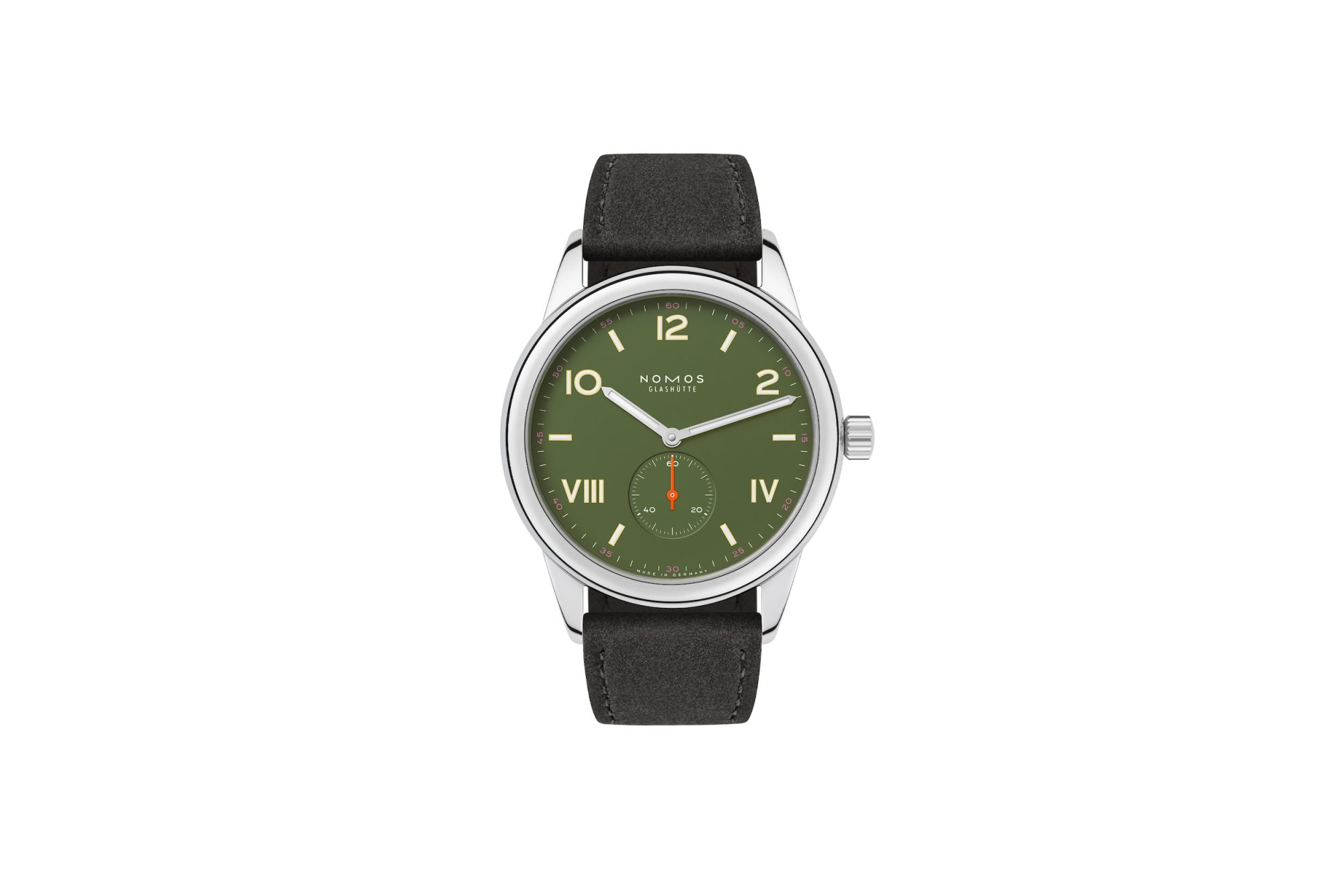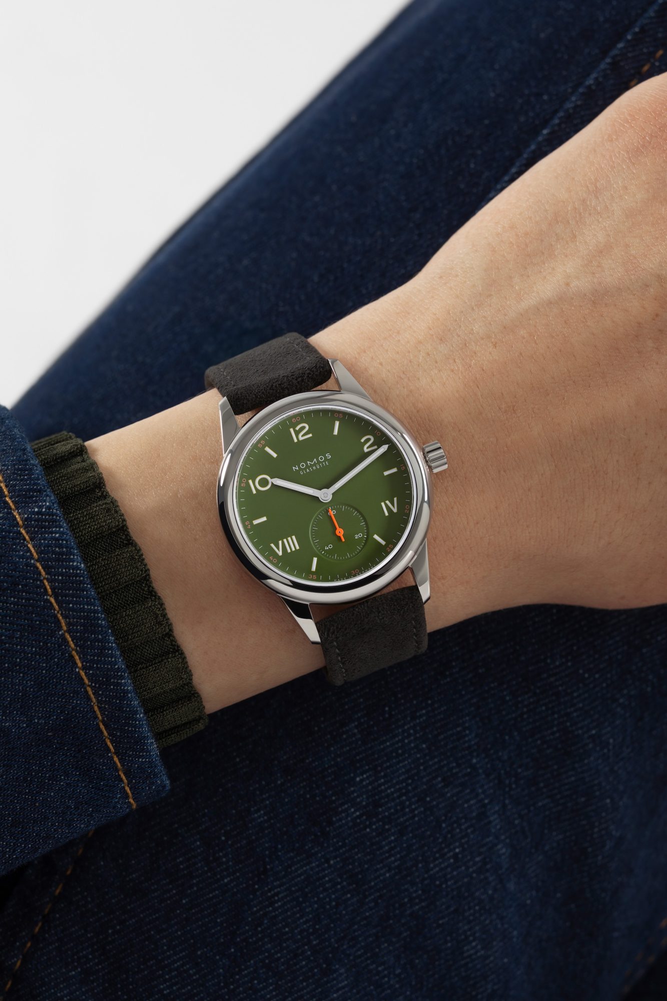 La version All Olive arbore un cadran vert profond, militaire sans être austère, rehaussé d’index et de chiffres aux contours jaunes et d’une aiguille de petite seconde orange vif. Le mélange de chiffres arabes (12, 10, 2) et romains (VIII, IV) — signature visuelle de la Club Campus — prend une dimension presque vintage sur ce fond kaki. C’est une montre qui fonctionnera aussi bien avec un chino qu’avec une surchemise en flanelle.