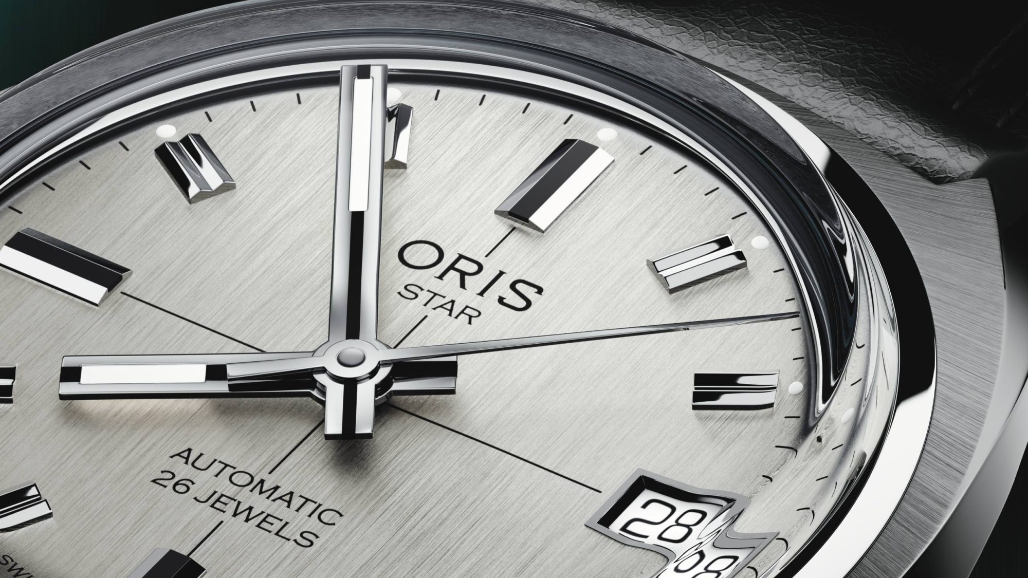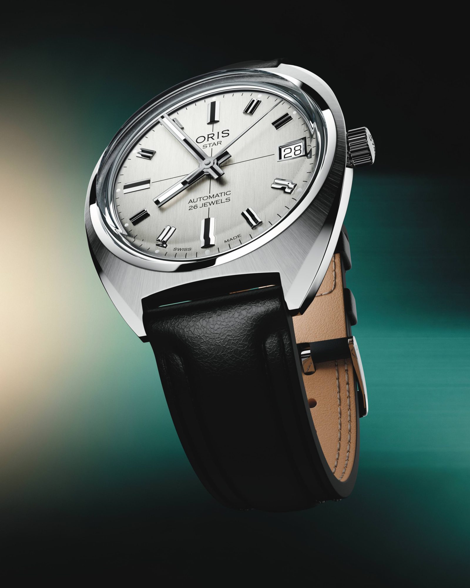 Le cadran argenté brossé est d’une sobriété remarquable. Les index bâtons sont appliqués, les aiguilles ont ces extrémités carrées caractéristiques du modèle original, et les mentions « Star », « Automatic » et « 26 Jewels » sont placées en arc de cercle dans la partie basse du cadran, un trait typiquement sixties que les amateurs reconnaîtront tout de suite. Le guichet de date à 3 heures est asymétrique, encadré d’un cerclage poli qui ajoute un soupçon de profondeur.