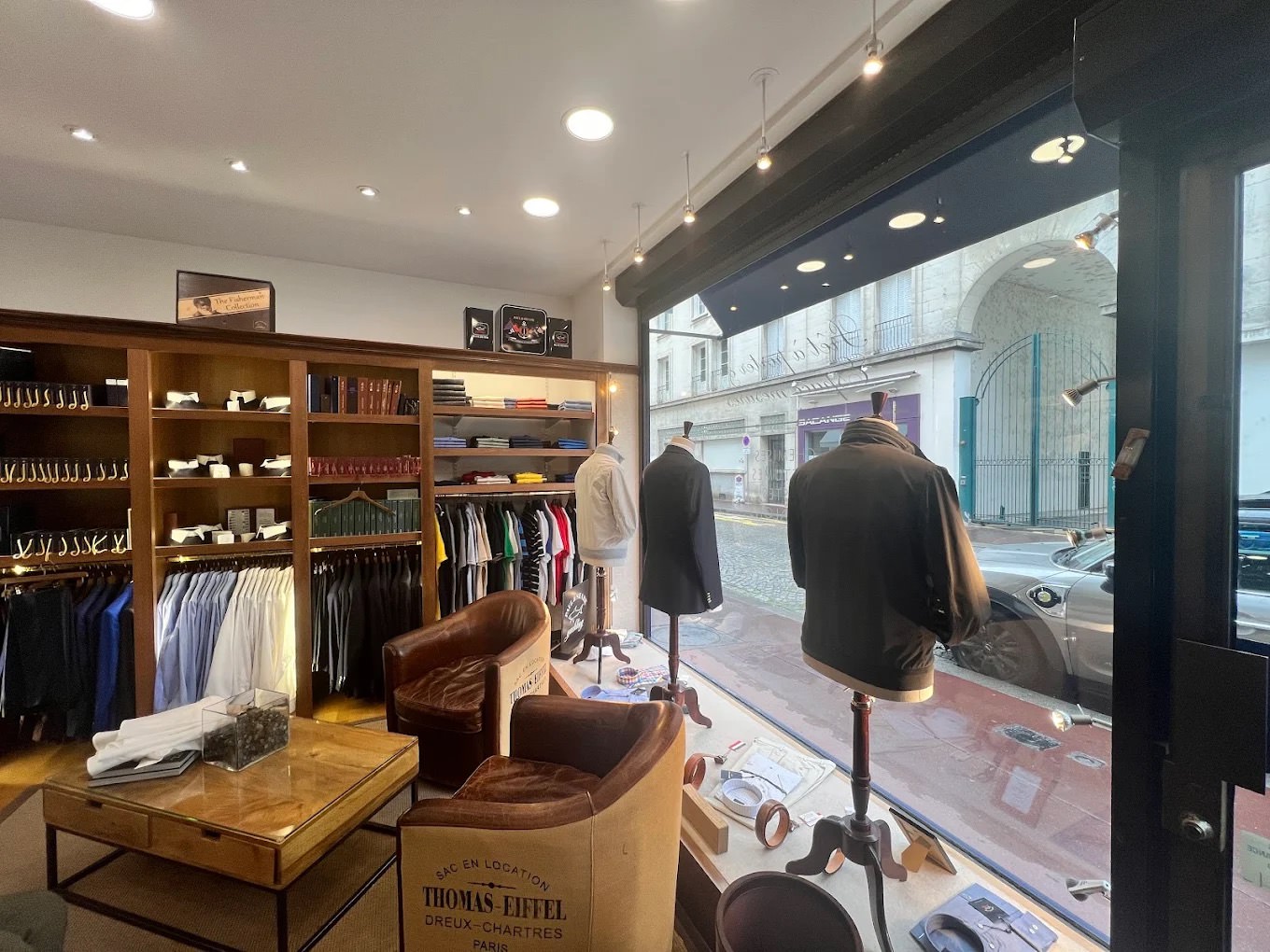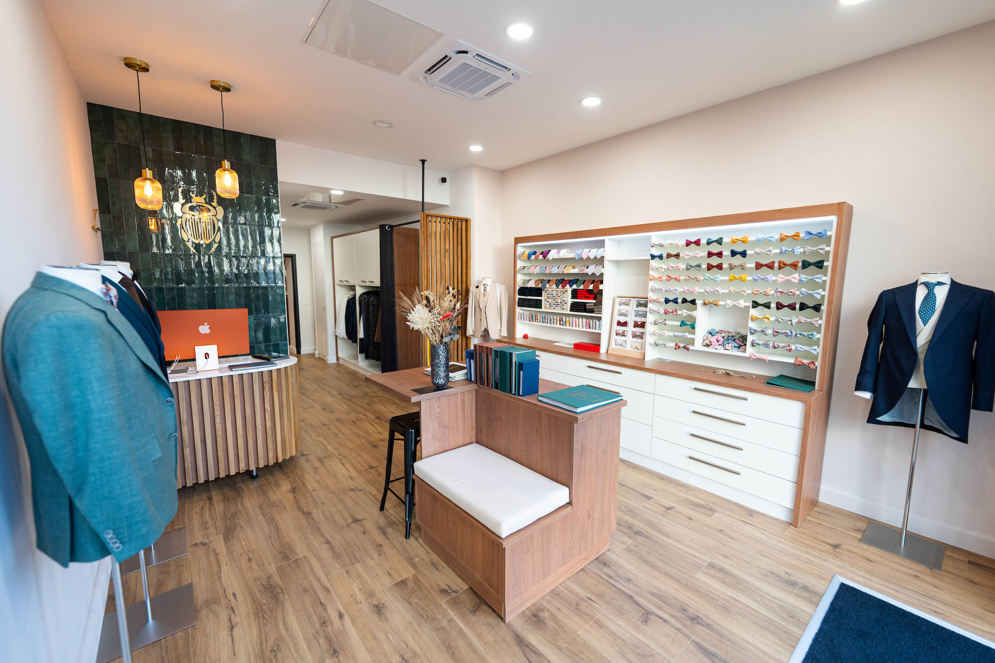 La boutique combine sur-mesure et prêt-à-porter haut de gamme (Bernard Zins, Viyella, William Lockie, Hiltl), ce qui permet d’habiller l’intégralité d’un mariage : costume du marié en sur-mesure, cortège en prêt-à-porter premium, accessoires faits-main en France. Cette approche hybride simplifie considérablement la logistique des grands événements.