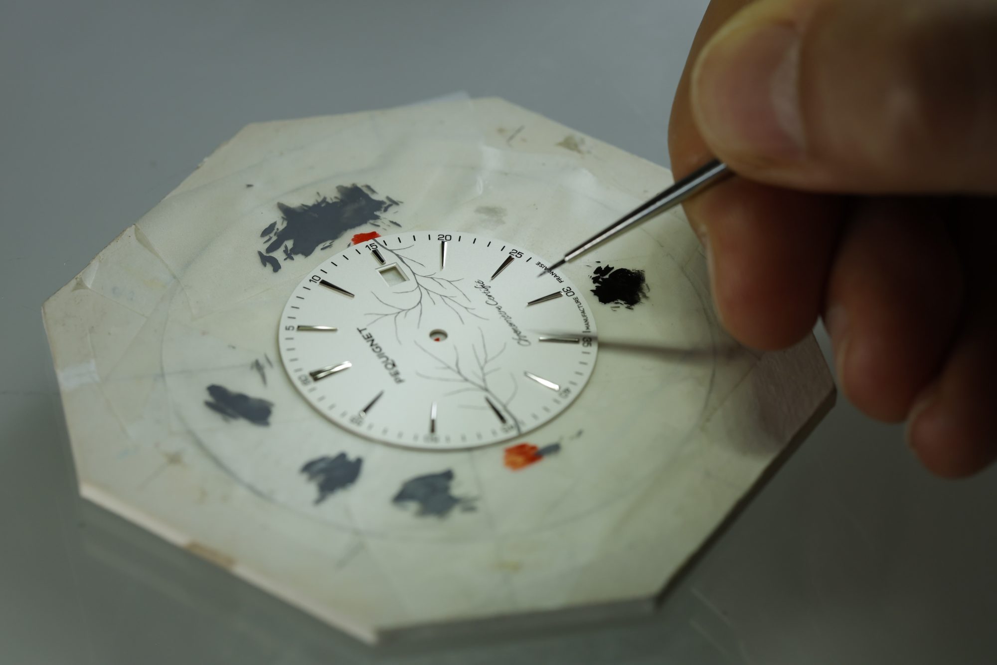 - Cadran : peint à la main par Philippe Jacquin-Ravot, décor chêne et cerisier, aiguilles frappées arrondies en acier bleui, grand guichet date à 3h