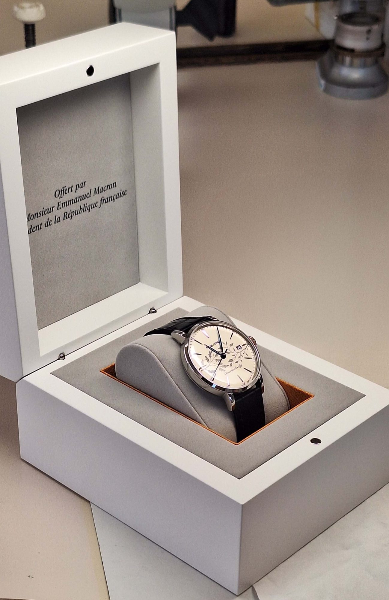 Les aiguilles frappées arrondies en acier bleui ont été façonnées par les ateliers La Pratique, à Morteau. Cette entreprise familiale, spécialisée dans la fabrication d’aiguilles de montres depuis plus d’un siècle, est l’un des derniers fabricants du genre en France. Le bracelet en alligator a été cousu à la main par la Manufacture Jean Rousseau, basée à Besançon, référence absolue du bracelet artisanal (on les retrouve chez les plus grandes maisons suisses). L’écrin sur-mesure, en bois laqué blanc et suédine gris pâle rehaussé de détails orange, est signé France Étuis, également à Besançon. Une inscription intérieure complète l’ensemble : « Offert par Monsieur Emmanuel Macron, Président de la République française ».