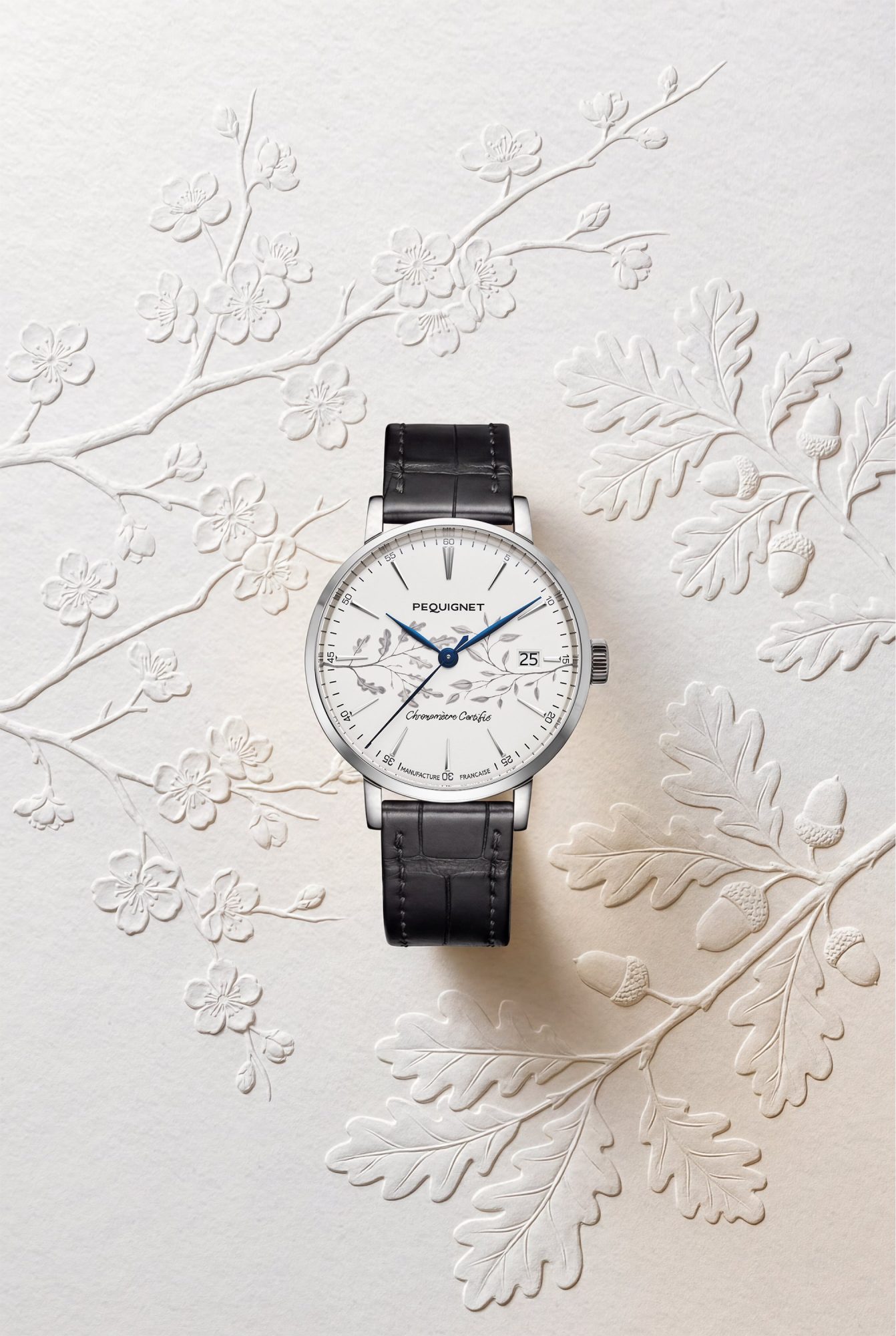 Sur le cadran de l’Attitude Impériale, Jacquin-Ravot a représenté deux branches entrelacées : le chêne, symbole de la force française, et le cerisier, emblème de l’élégance japonaise. L’allégorie diplomatique est limpide, presque littérale, mais elle fonctionne parce que l’exécution est d’une délicatesse remarquable. Sur un cadran de 39 mm, la finesse du trait et le jeu de nuances entre les deux essences végétales créent un décor à la fois lisible et subtil. C’est de l’horlogerie métier d’art, un créneau que la Suisse domine historiquement et sur lequel la France a tout intérêt à se positionner.