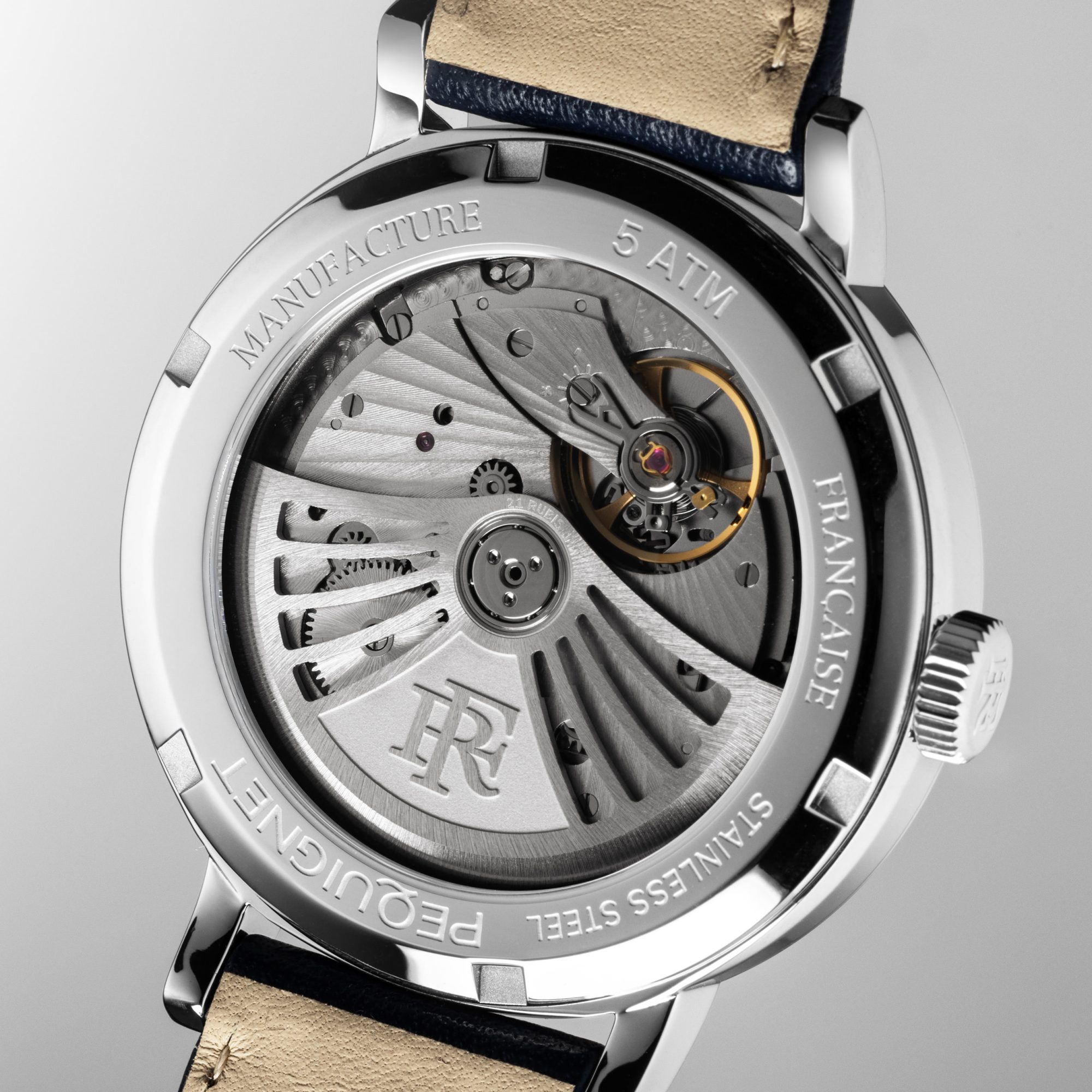 - Mouvement : Calibre Initial®, remontage bidirectionnel, 4 Hz (28 800 alt./h), réserve de marche 65 heures, 21 rubis, stop-seconde, masse oscillante ajourée avec décoration colimaçonnage et logo « RF »