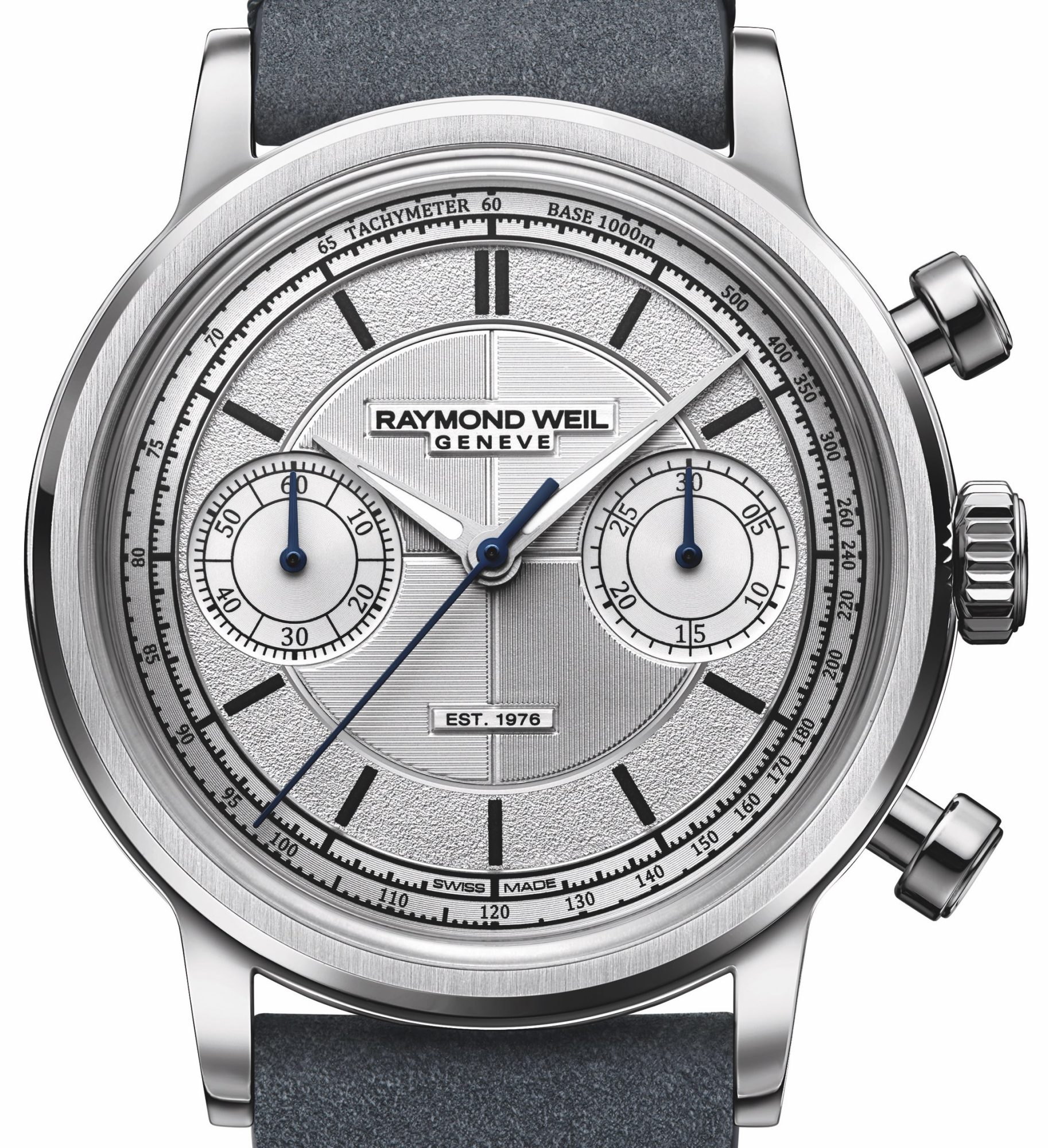 Le rehaut accueille l’échelle tachymétrique et un filet diamanté. La zone sous les index est ornée d’un décor grainé qui capte la lumière avec un éclat presque cristallin. La partie centrale présente un motif « tapisserie » en gaudrons alternés, inspiré de la signature visuelle de la collection Millesime, avec le logo Raymond Weil et la mention « EST. 1976 » en décalque surélevée. Les deux compteurs, réalisés séparément, bénéficient chacun d’un traitement azuré spécifique. Les aiguilles « obélisque » sont satinées et nickelées avec SuperLumiNova, les aiguilles du chronographe sont polies et bleuies.