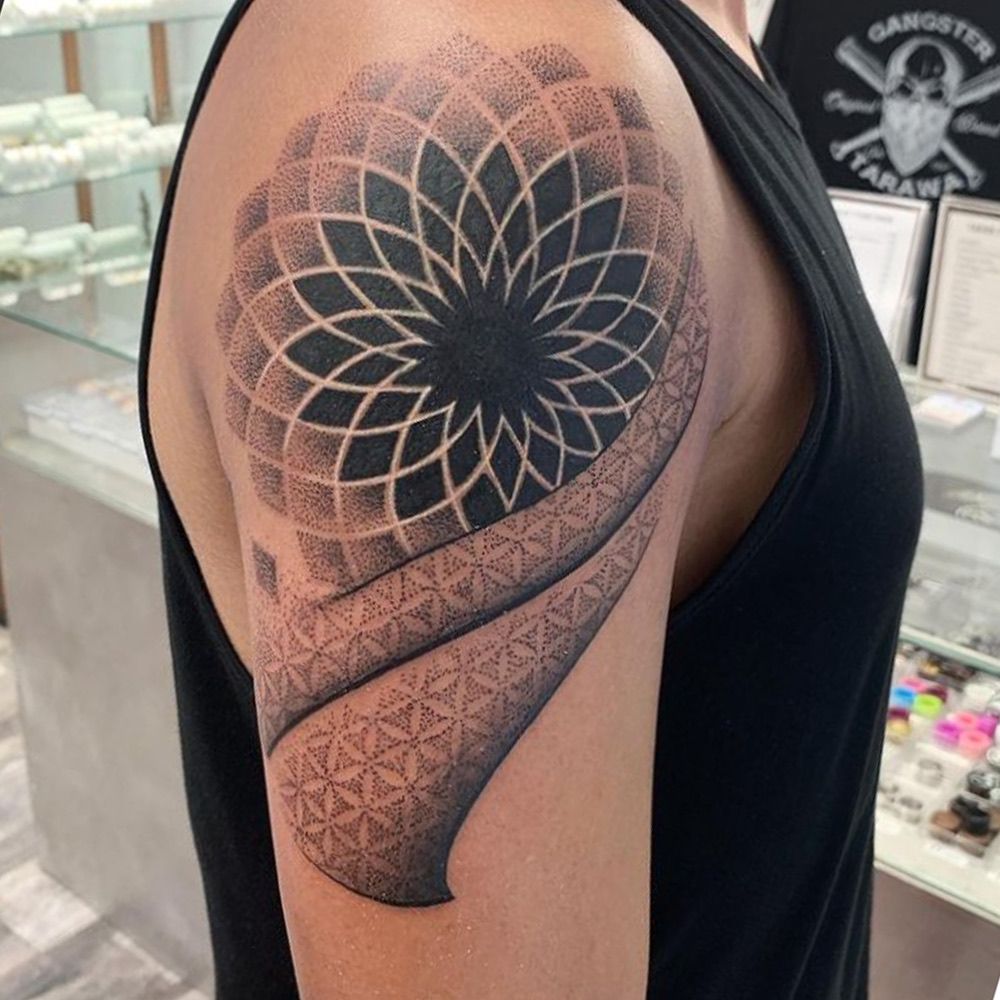 Composé entièrement de petits points, le dotwork crée des effets de relief remarquables. C’est très technique et demande une grande expertise. Idéal pour les mandalas, les motifs géométriques ou les portraits stylisés. Attention : les résultats sont fortement dépendants du tatoueur.