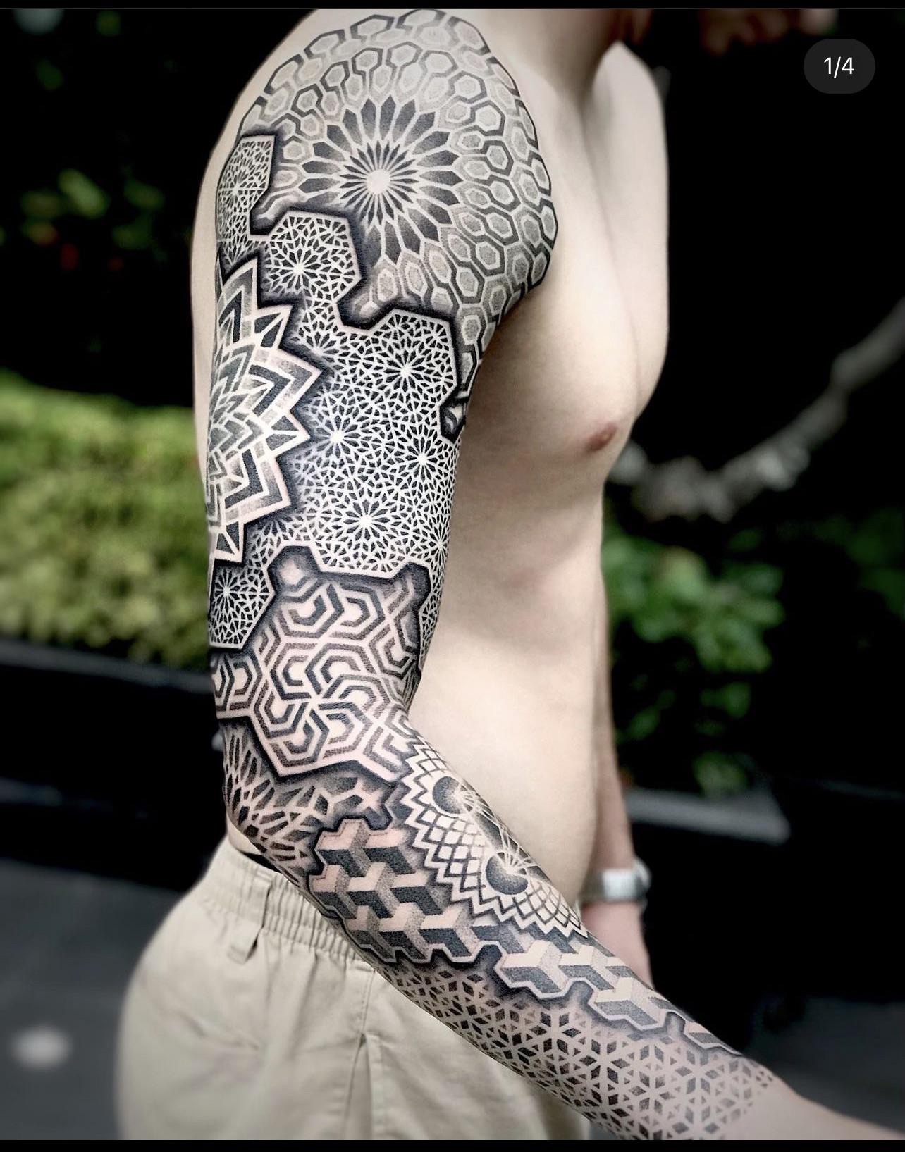 Triangles, carrés, cercles, losanges… assemblés pour former des motifs hypnotisants. C’est moderne, esthétique, et cela vieillit bien. Le géométrique s’adapte à toutes les morphologies et demande une précision chirurgicale. Parfait pour ceux qui aiment les formes et la symétrie.