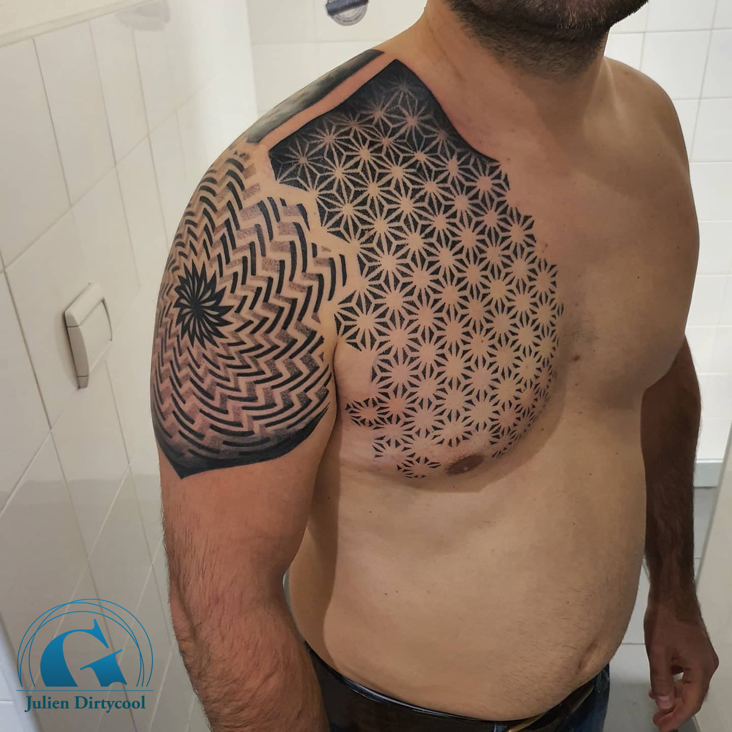 Tout en noir, souvent géométrique ou abstrait. C’est puissant, intemporel, et demande un sens esthétique prononcé. Certains tatoueurs font du blackwork pur, d’autres le mélangent avec d’autres styles.