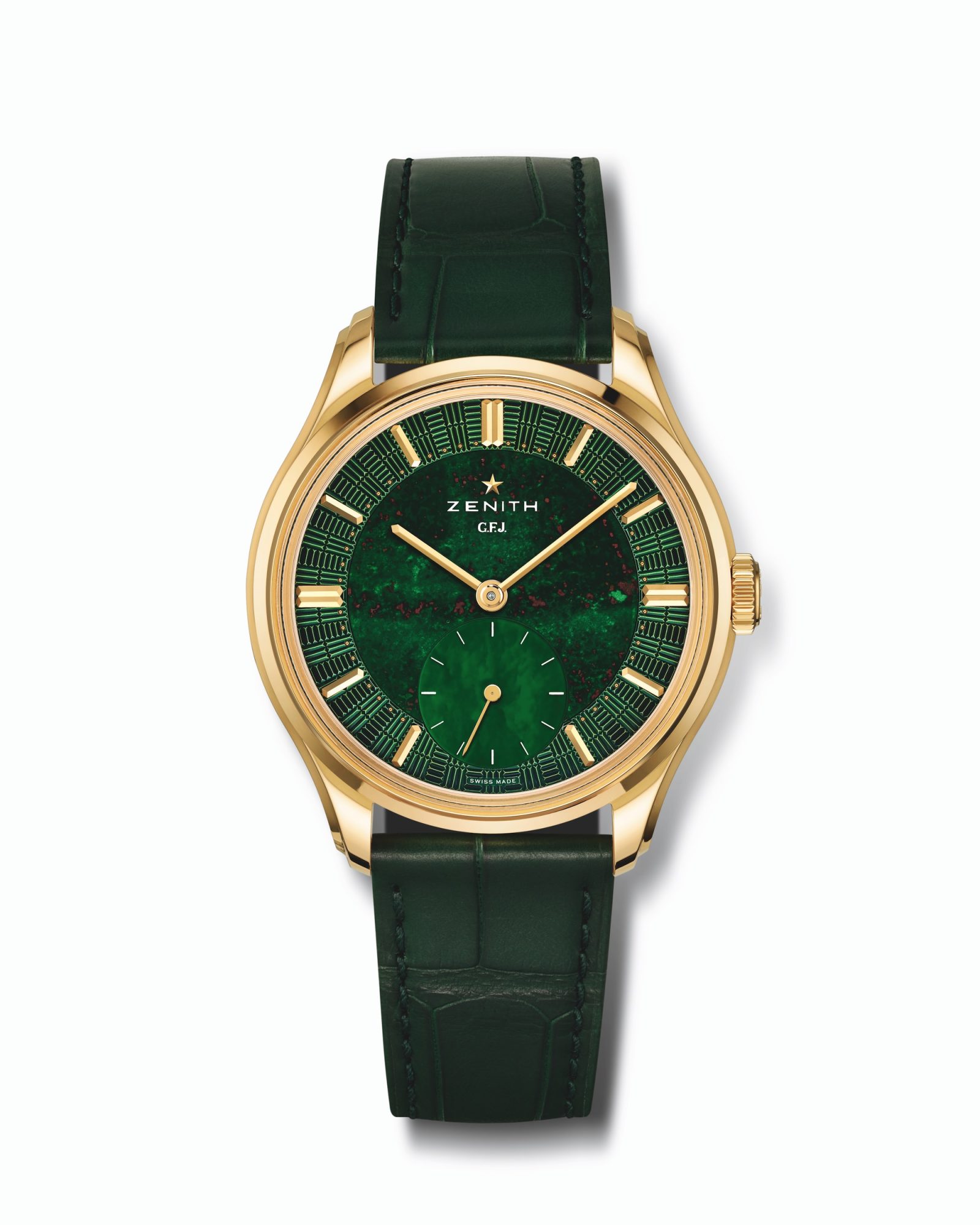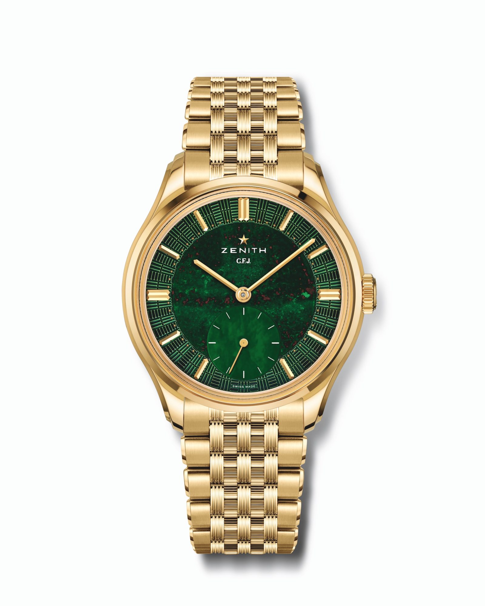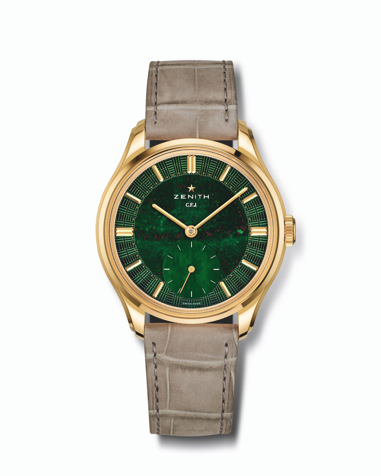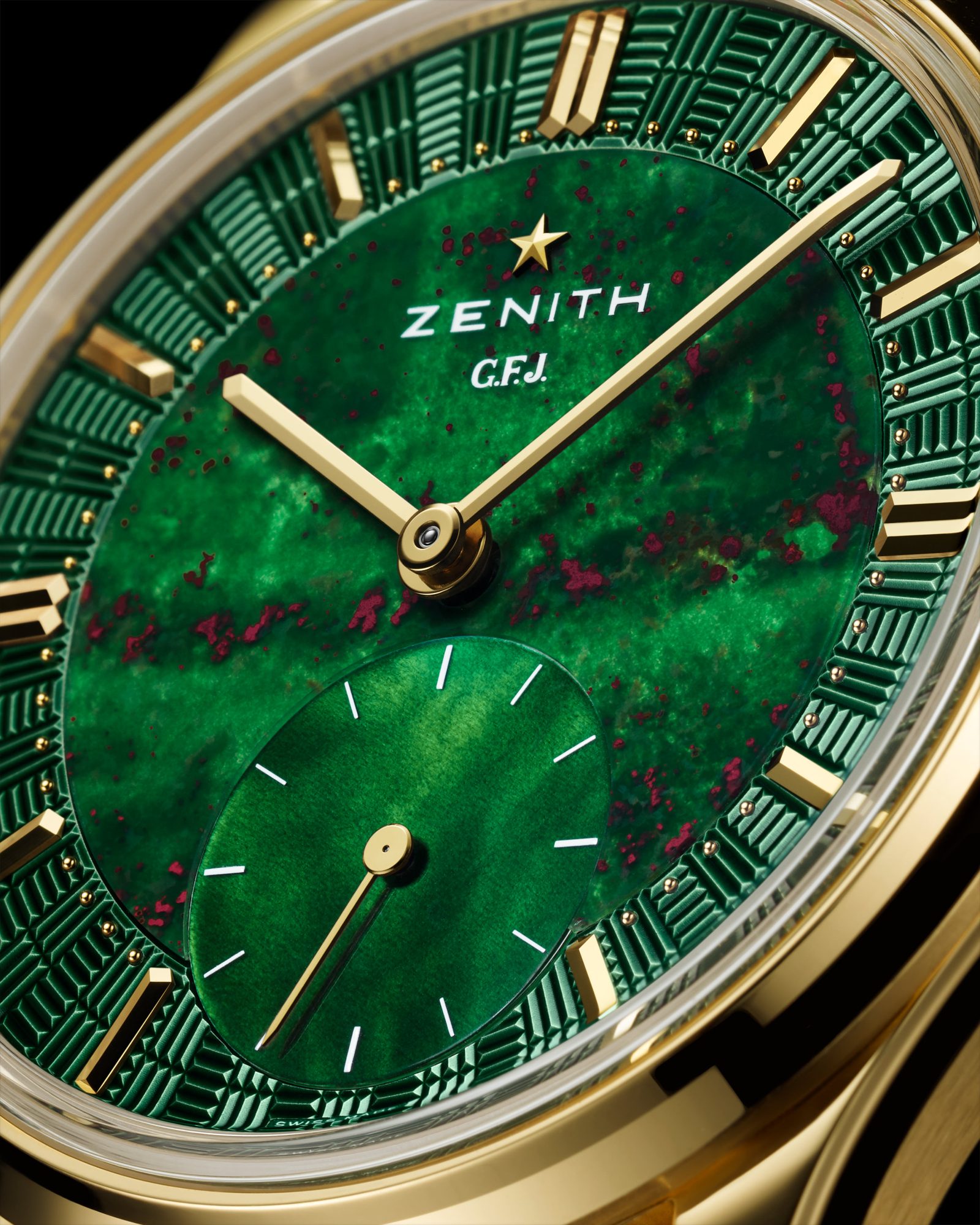 C’est sur le cadran que les choses deviennent particulièrement intéressantes. L’architecture en trois parties, fidèle à la construction originale, se décline ici avec un disque central en jaspe sanguin. Cette pierre semi-précieuse, parcourue de veines naturelles et d’inclusions rouges sur fond vert sombre, rend chaque exemplaire visuellement unique. À 6 heures, le compteur de petite seconde surdimensionné est réalisé en nacre verte, tandis que le secteur périphérique reprend le motif guilloché « briques » inspiré de la façade de la manufacture Zenith située au Locle. Des index appliqués et des aiguilles facettées en or jaune complètent l’ensemble.